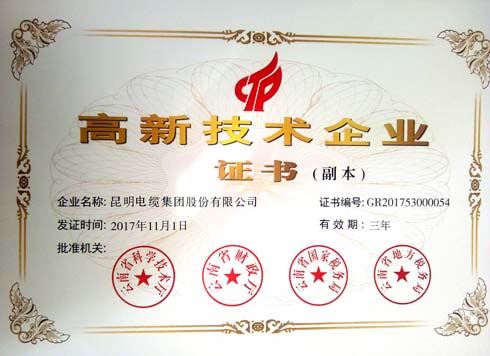 2017年12月,昆明電纜集團股份有限公司再次通過(guò)了高新技術(shù)企業(yè)的認定,被云南省科學(xué)技術(shù)廳、云南省財政廳、云南省國家稅務(wù)局、云南省地方稅務(wù)局認定為“高新技術(shù)企業(yè)”。